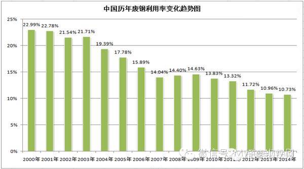從中國煉鋼廢鋼比數據看,近年來呈下跌趨勢,“九五”期間我國廢鋼比年平均為24.2%,“十五”時期的廢鋼比年平均為20.6%,“十一五”時期的廢鋼比年平均為14.4%,“十二五”期間的廢鋼比年平均為11.7%,20年中煉鋼廢鋼比例降低了12.5%。