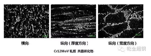 (1)鍛件的軸向和徑向力學性能差異較軋件差異小,也就是說,鍛件的各向同性要遠遠高于軋件的各向同性,所以說鍛件的壽命要遠遠高于軋件。下圖為Cr12MoV軋板不同方向共晶碳化物的形態的金相圖。